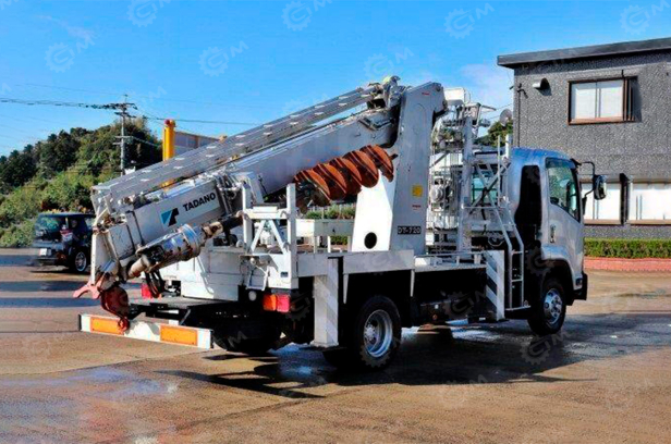 Базой служит шасси ISUZU 4×4 с двигателем мощностью 151 kW, обеспечивающим устойчивую работу оборудования и проходимость на трудных участках. Установлена крановая установка WANBANG SQS350DZ грузоподъёмностью 3,5 тонны с 3 секциями и стрелой длиной 14 м с возможностью работы с отрицательным углом, что расширяет диапазон рабочих положений. В комплектацию входит бур длиной 10 м диаметром 400 мм для выполнения буровых работ, а также корзина для проведения высотных операций.
