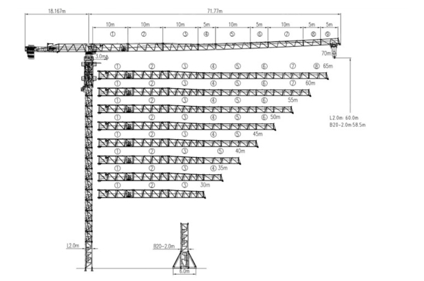 Модель выполнена без оголовка, с грузоподъёмностью до 12 т. Высота подъёма достигает 72 м, длина стрелы — 60 м, при этом на конце стрелы кран способен поднимать до 3 т, что позволяет эффективно работать как вблизи башни, так и на удалённых участках стройплощадки. Секция башни размером 1,6×1,6×3,0 м устанавливается на анкерное основание, обеспечивая устойчивость и надёжность конструкции при эксплуатации под нагрузкой.