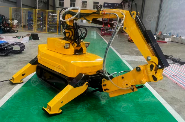 Экскаватор оснащён гусеничным ходом, обеспечивающим устойчивость и уверенное передвижение по слабым и неровным основаниям. В стандартную комплектацию входят ковш и гидромолот, что позволяет выполнять как выемку грунта, так и разрушение бетона, асфальта и других твёрдых покрытий без смены техники. Пульт дистанционного управления (ПДУ) значительно повышает безопасность и удобство работы, позволяя оператору управлять машиной на расстоянии, особенно при демонтаже и работах в потенциально опасных зонах.