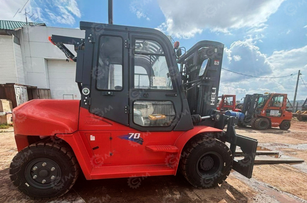 Погрузчик оснащён дизельным двигателем и рассчитан на грузоподъёмность 7 тонн, обеспечивая высоту подъёма до 4,5 метров. Модель оборудована двухсекционной мачтой, обеспечивающей надёжный подъём груза, а также вилами длиной 2 метра, что удобно при работе с длинномерными или крупными паллетами. Наличие автоматической коробки передач упрощает управление техникой и повышает плавность движения. Закрытая кабина с отопителем обеспечивает комфортные условия для оператора при работе в холодное время года.