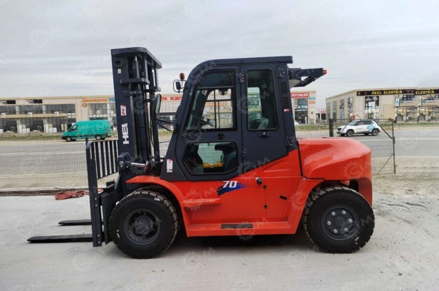 Погрузчик оснащён дизельным двигателем и рассчитан на грузоподъёмность 7 тонн, что позволяет эффективно работать с массивными грузами. Мачта обеспечивает высоту подъёма до 7 метров, благодаря чему техника подходит для работы на складах с высокими стеллажами. Машина оборудована закрытой кабиной с отопителем, что создаёт комфортные условия для оператора при эксплуатации в холодное время года и позволяет использовать погрузчик как в помещениях, так и на открытых площадках.